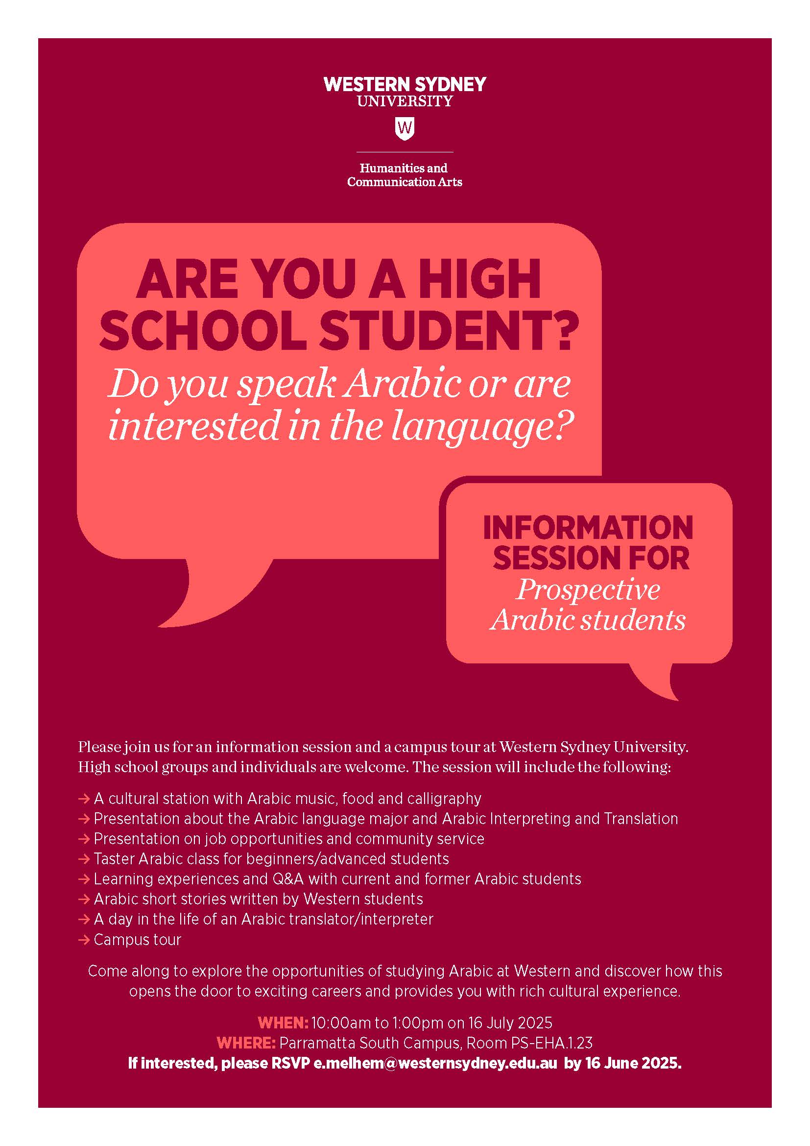 .هل أنت طالب في المرحلة الثانوية وتفكّر في دراسة اللغة العربية؟ ندعوك للانضمام إلينا يوم الأربعاء 16 يوليو تموز في جلسة مميّزة بجامعة غرب سيدني، لتتعرّف على الفرص الواعدة التي تتيحها لك دراسة هذه اللغة الغنية