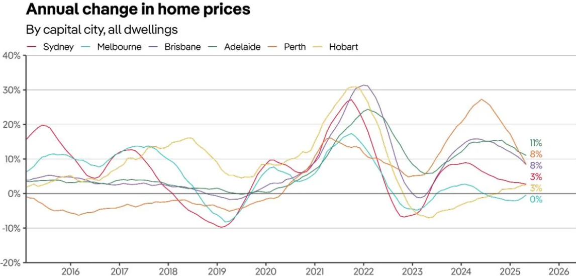 وشهدت كل من سيدني وملبورن أسرع معدلات نمو فصلية في أسعار المنازل منذ سنوات، حيث ارتفع السعر الوسيط في سيدني بنسبة 2.6% ليصل إلى 1.7 مليون دولار — وهو أعلى مستوى على الإطلاق. وفي ملبورن، ارتفع بنسبة 2.3% ليصل إلى أكثر من مليون دولار، وهو أعلى سعر منذ ثلاث سنوات.