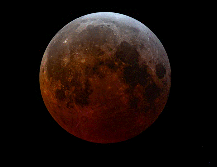 تحدث الدرجة اللونية المحمرة للخسوف الكلي للقمر بسبب مرور الضوء عبر الغلاف الجوي للأرض، الذي يقوم بتصفية جميع الألوان باستثناء اللون الأحمر. يُطلق على هذا التأثير اسم “تشتت رايلي”، وهو نفسه الذي ينتج غروب الشمس الأحمر.