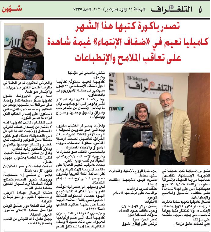 كاميليا نعيم، ستوقّع كتابها الأول”ضفاف الإنتماء” في 20 أيلول سبتمبر في صالة الأمبوريوم في بانكستاون.